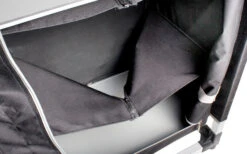 Gran armario multifuncional de camping con 2 compartimentos separados con cremallera y 6 estantes interiores. El compartimento más estrecho también puede convertirse en armario gracias a las baldas divisibles del centro y a la barra de colgar incorporada. Diseño muy robusto con bastidor transversal de aluminio y perfiles rectangulares resistentes a la torsión. Las paredes delantera y trasera pueden estabilizarse adicionalmente mediante un dispositivo de sujeción especial. Los amplios reposapiés giratorios evitan que el armario se hunda en suelos blandos o que se dañe el suelo o la moqueta de la tienda. Un pie regulable en altura permite una perfecta nivelación en caso de suelos irregulares. Una ventana de gasa en la pared trasera proporciona ventilación interior al armario. Con práctica bolsa de transporte y almacenamiento.