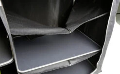Un marco premontado de aluminio, sobre el que se coloca una cubierta de alta calidad hecha de poliéster resistente, forma el marco de los armarios de color antracita. Los canales de diseño de poliéster resistente a la abrasión de la cubierta, que tiene una gasa de ventilación integrada en la parte posterior, garantizan un montaje y desmontaje rápido, y los estantes se insertan simplemente. Todos los pies de la plataforma giratoria son ajustables en altura y garantizan un soporte seguro incluso en superficies irregulares. Un estante forma el extremo superior de la construcción del establo. El envío incluye una práctica bolsa de transporte y almacenamiento.