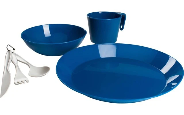 Robusta vajilla de plástico, ideal para el senderismo y las actividades al aire libre, embalada en una práctica bolsa de malla