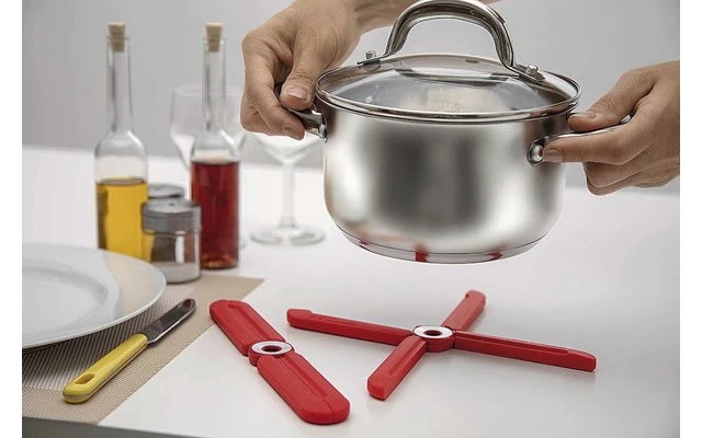 Trébede de diseño WEDO fabricado en silicona. Práctico salvamanteles que ahorra espacio con un diseño sofisticado, inspirado en las clásicas máquinas de hélice de la historia de la aviación. El discreto diseño con el anillo de acero inoxidable cepillado encaja de forma intemporal en cualquier diseño interior y no tiene por qué esconderse en un cajón. Plegada en forma de cruz, sostiene con seguridad sartenes, ollas y platos para hornear de hasta 25 cm de diámetro. La suciedad puede limpiarse con una esponja suave bajo el agua caliente.