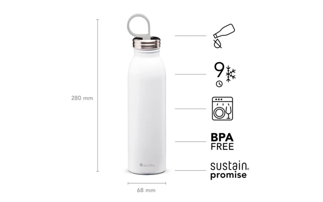 La nueva botella de agua de acero inoxidable Aladdin Chilled Thermavac es una botella de agua portátil y elegante que garantiza que el agua se mantenga fresca y bien fría durante muchas horas y realmente fría durante al menos 9 horas.